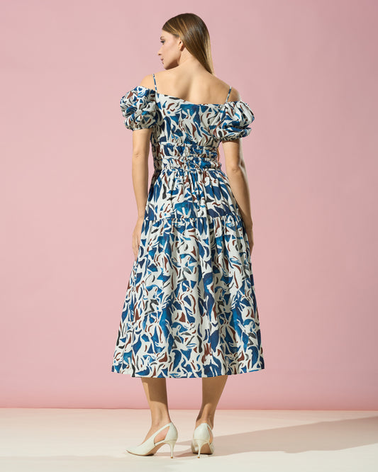 Abstract Puff-Sleeve Midi Dress