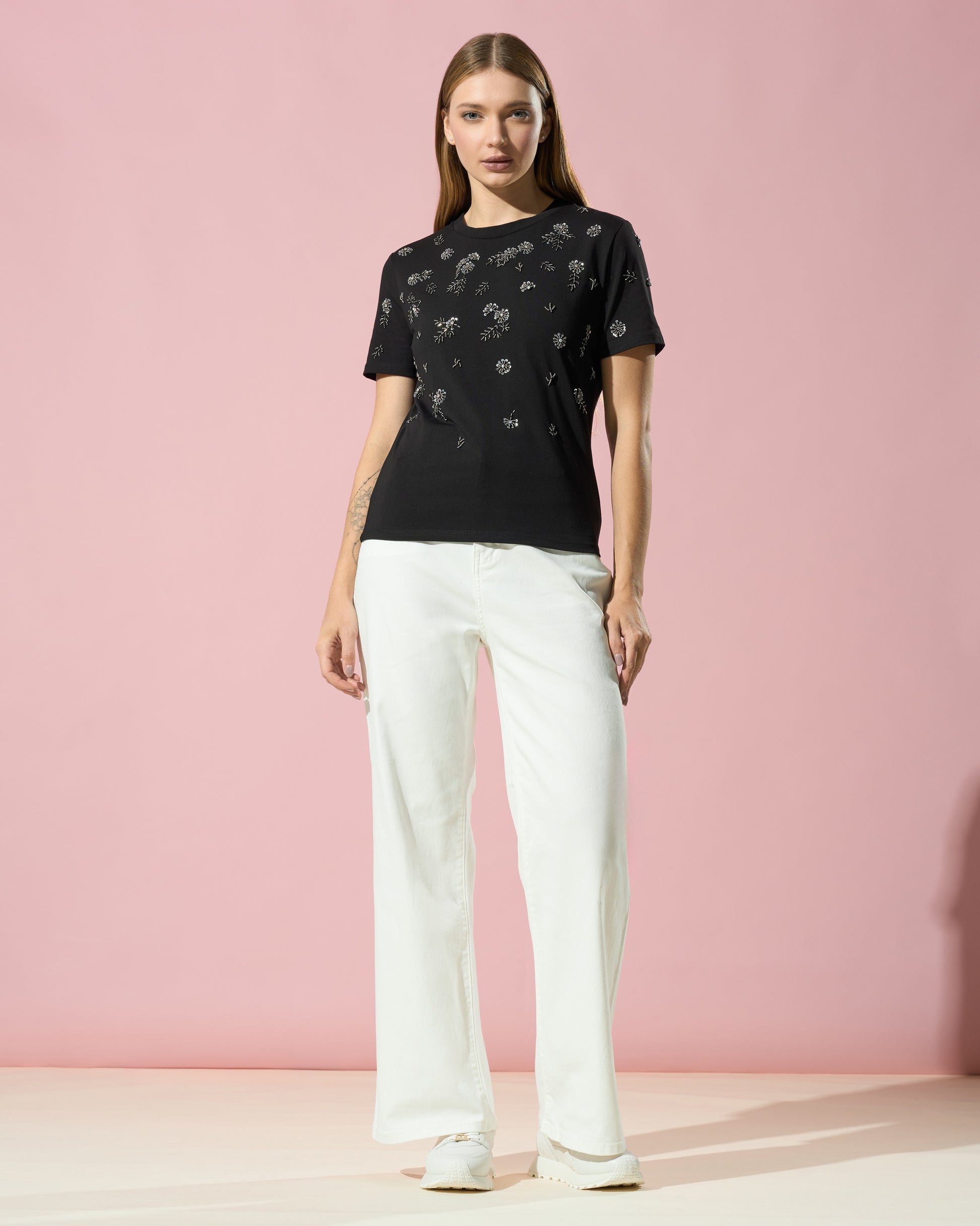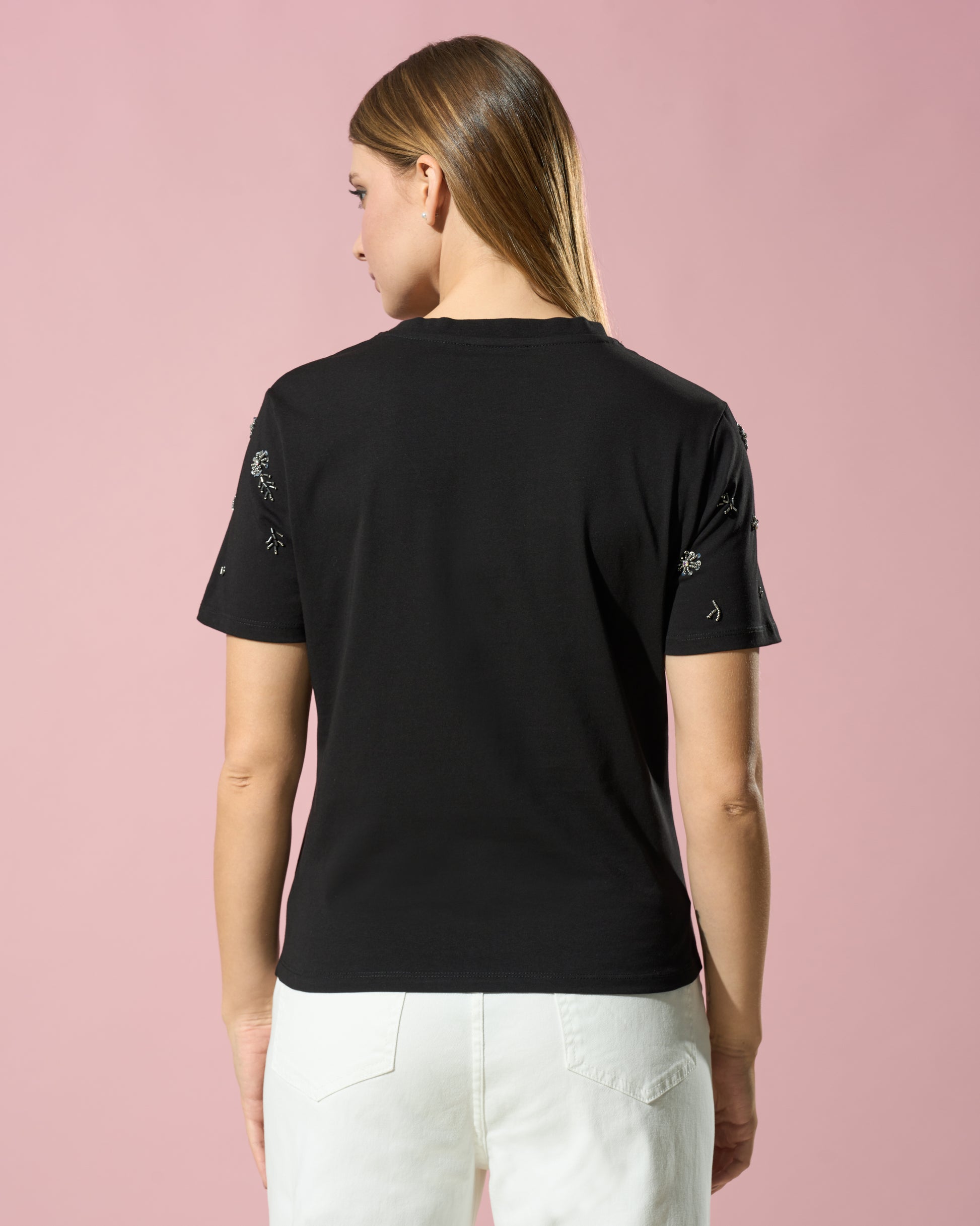 Designed for a relaxed fit, it offers everyday versatility, while sparkling crystal embellishments elevate its appeal, bringing an opulent twist to a casual silhouette.
