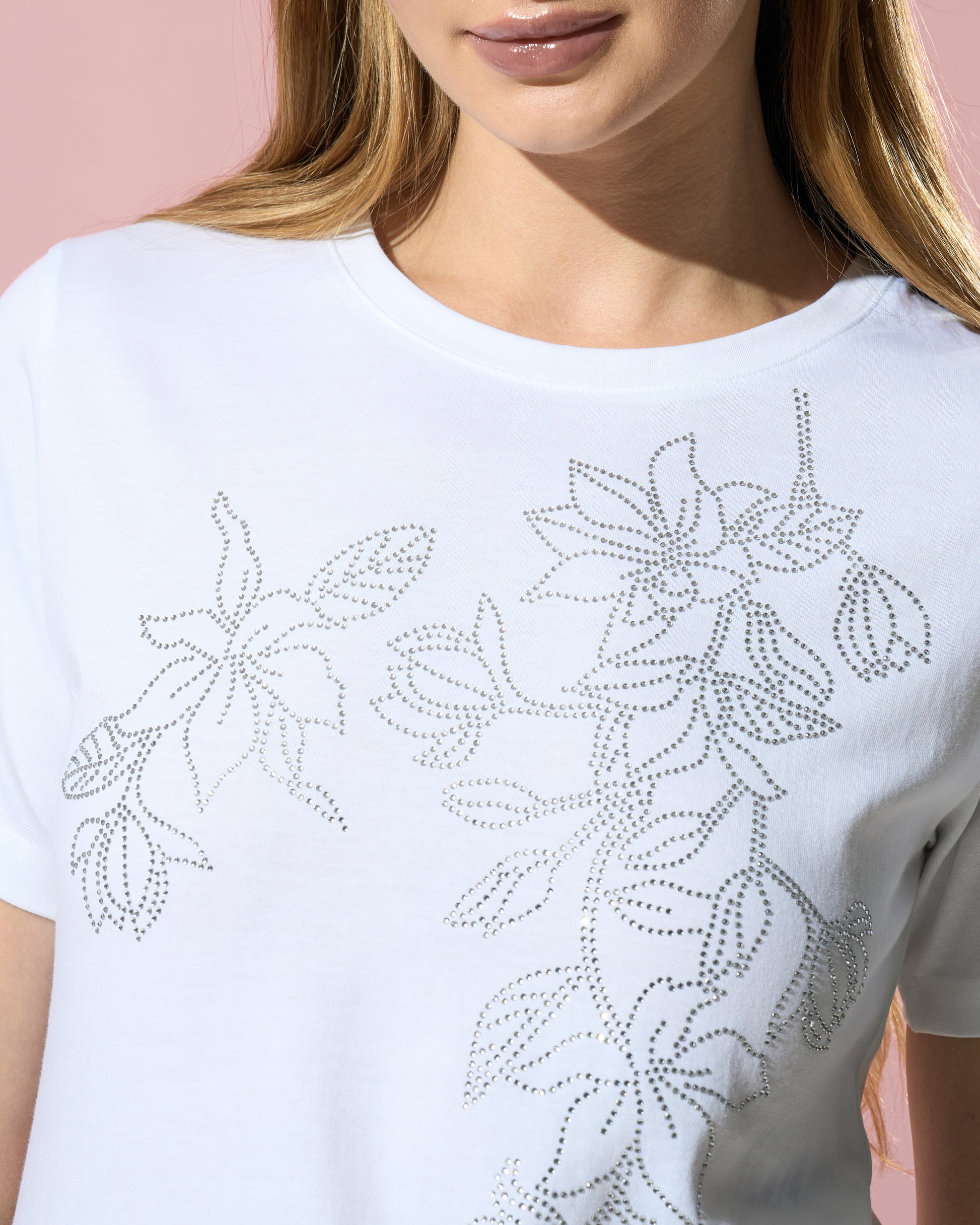 Crafted from soft cotton, this piece features glistening crystal accents that add glamour to its relaxed silhouette, transforming a casual staple into a statement.