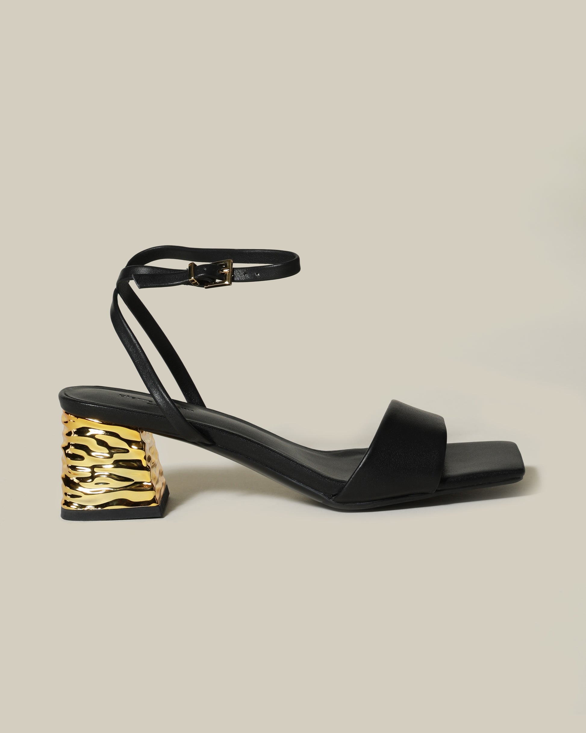Be in your impeccable fashion moment with these block heels featuring gold-tone accents and a strappy design for an ultimate feminine appeal.