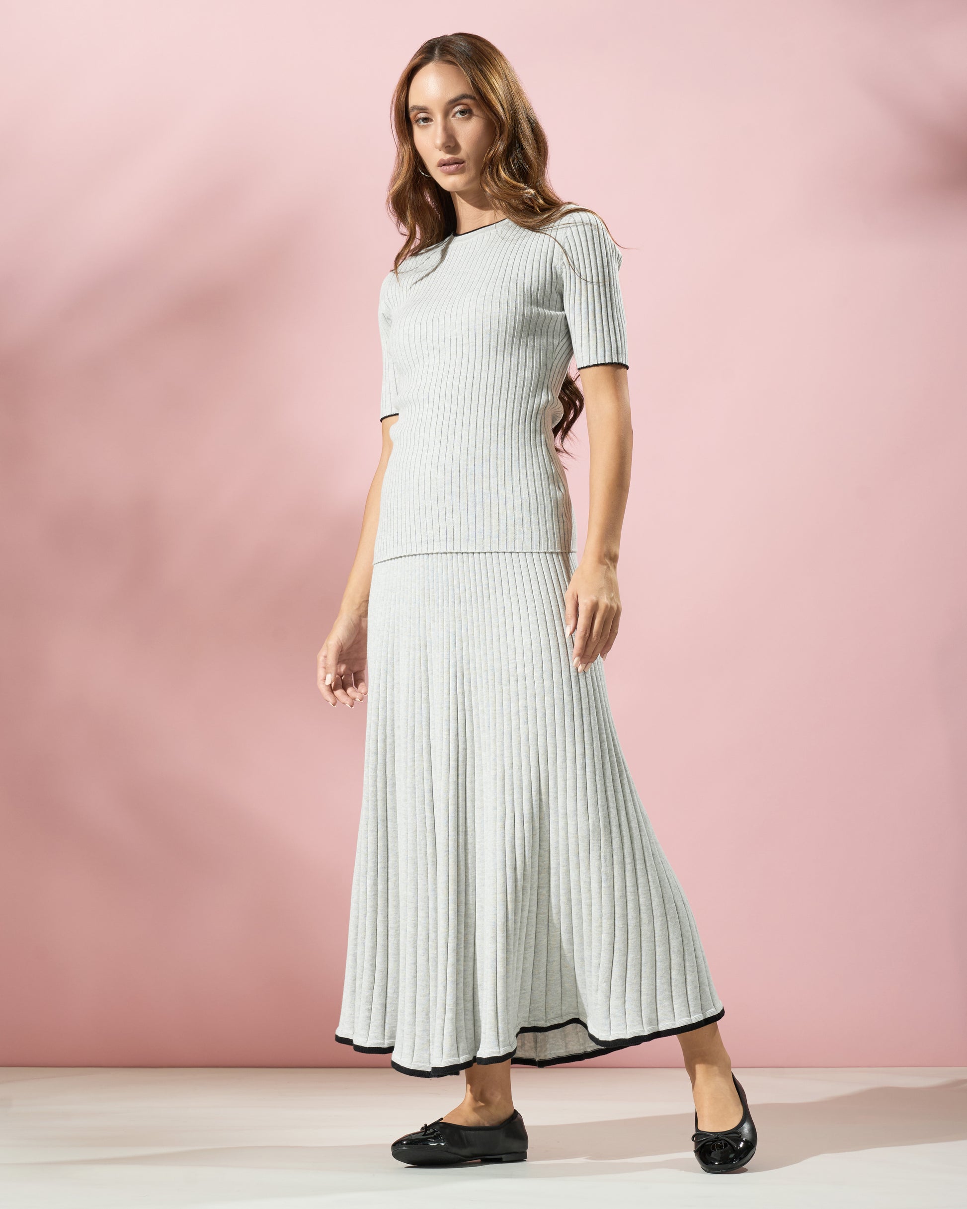 For effortless style with a touch of sophistication, this grey melange ribbed knit tee fits you like a dream. The slim silhouette and round neckline create a flattering shape, while the contrast trim on the neck and sleeves adds a subtle pop of detail.