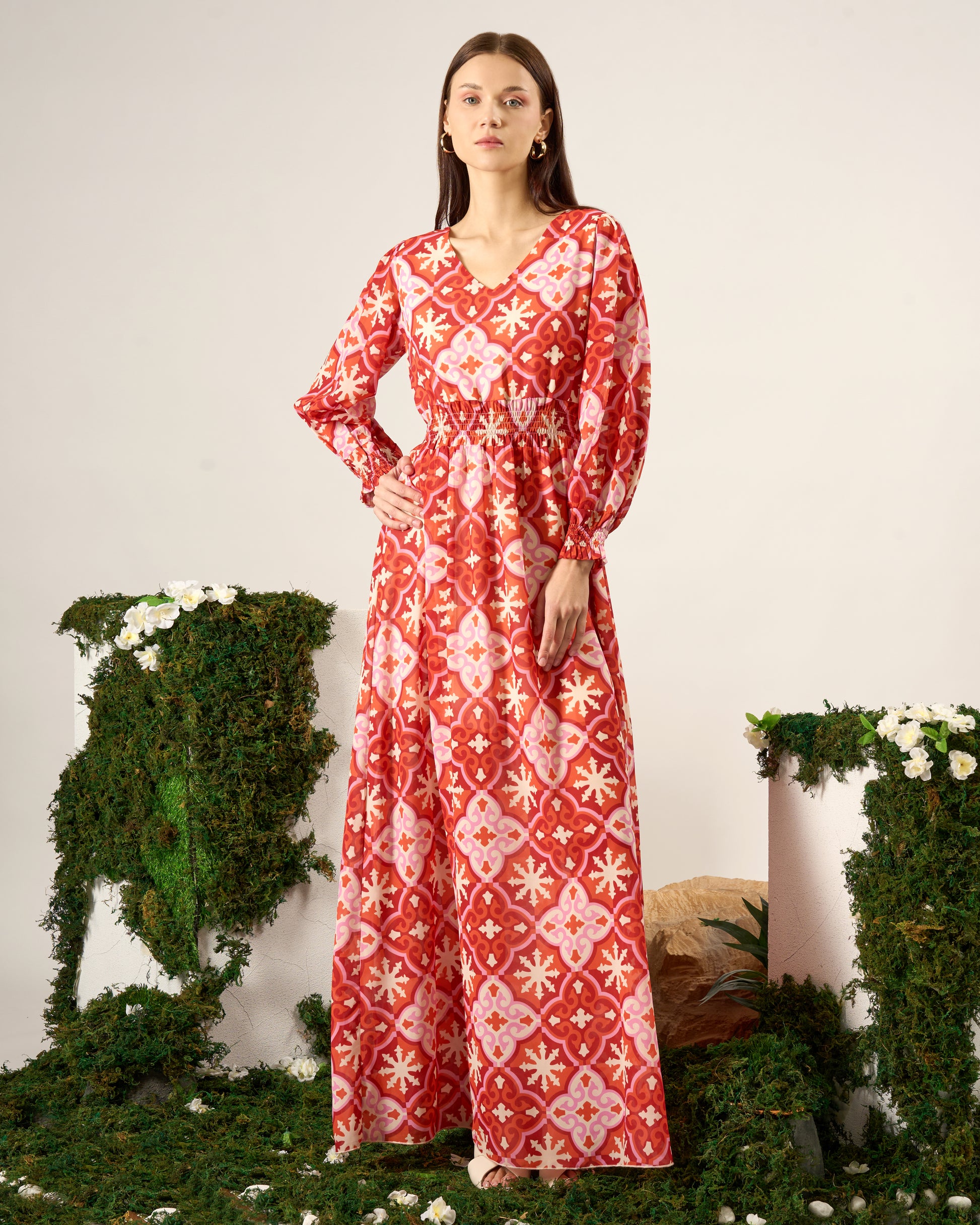 Brighten up your wardrobe with effortless charm. This maxi dress features a vibrant tile-inspired print. The flowing sleeves and a breezy silhouette make it perfect for any sunlit occasion.