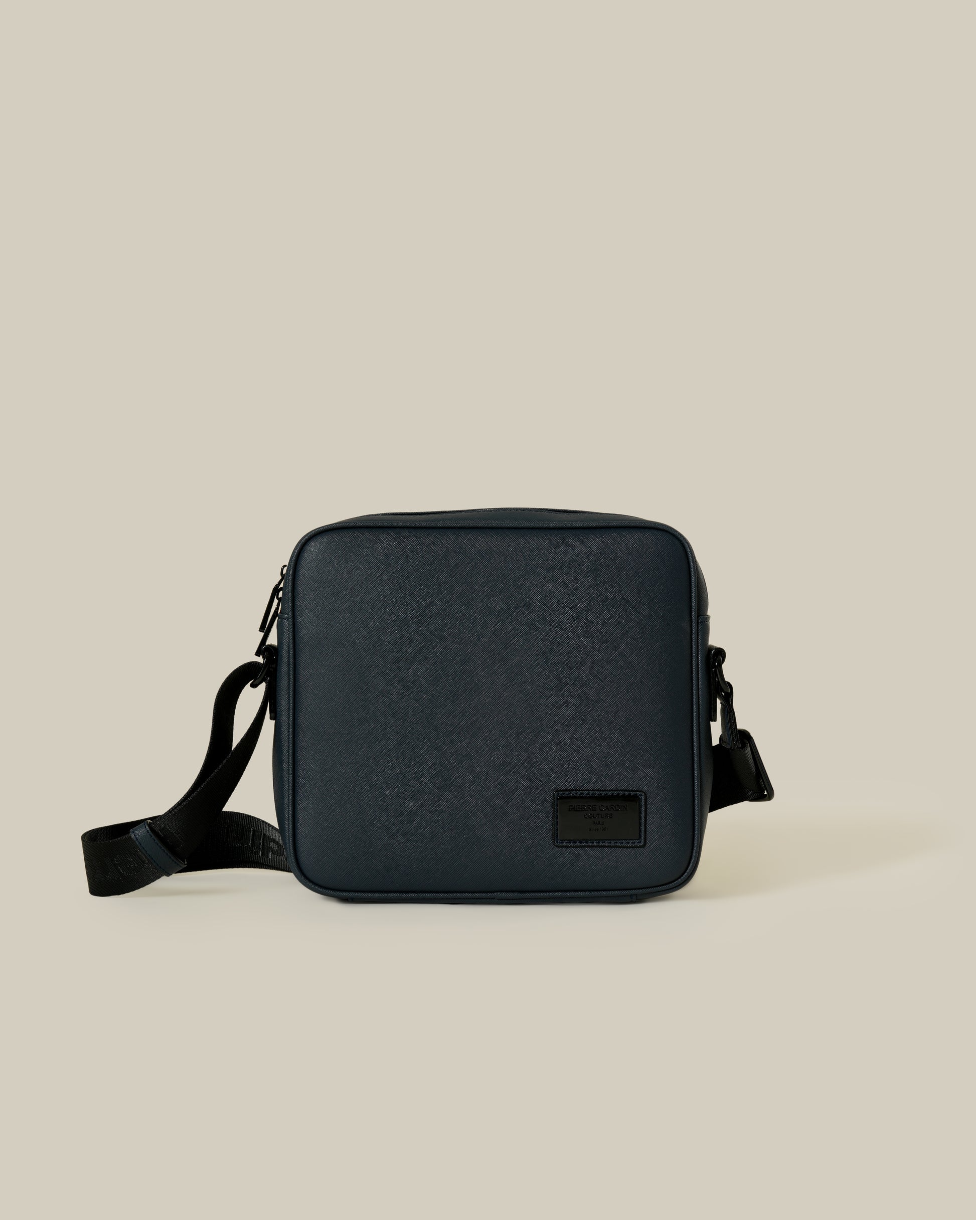 Weekends just got a whole lot easier with this roomy crossbody in navy. Top zip access, adjustable woven strap and detailed with metal plate.