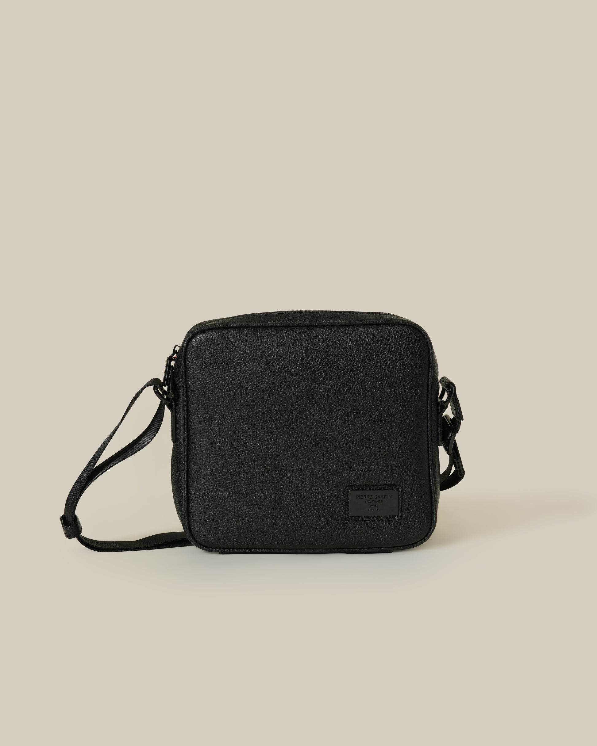 Keep things simple with this minimalist crossbody bag that delivers major functionality. Made from milled leather in black, it comes with top zipper fastening, adjustable woven shoulder strap and metal plate on front.