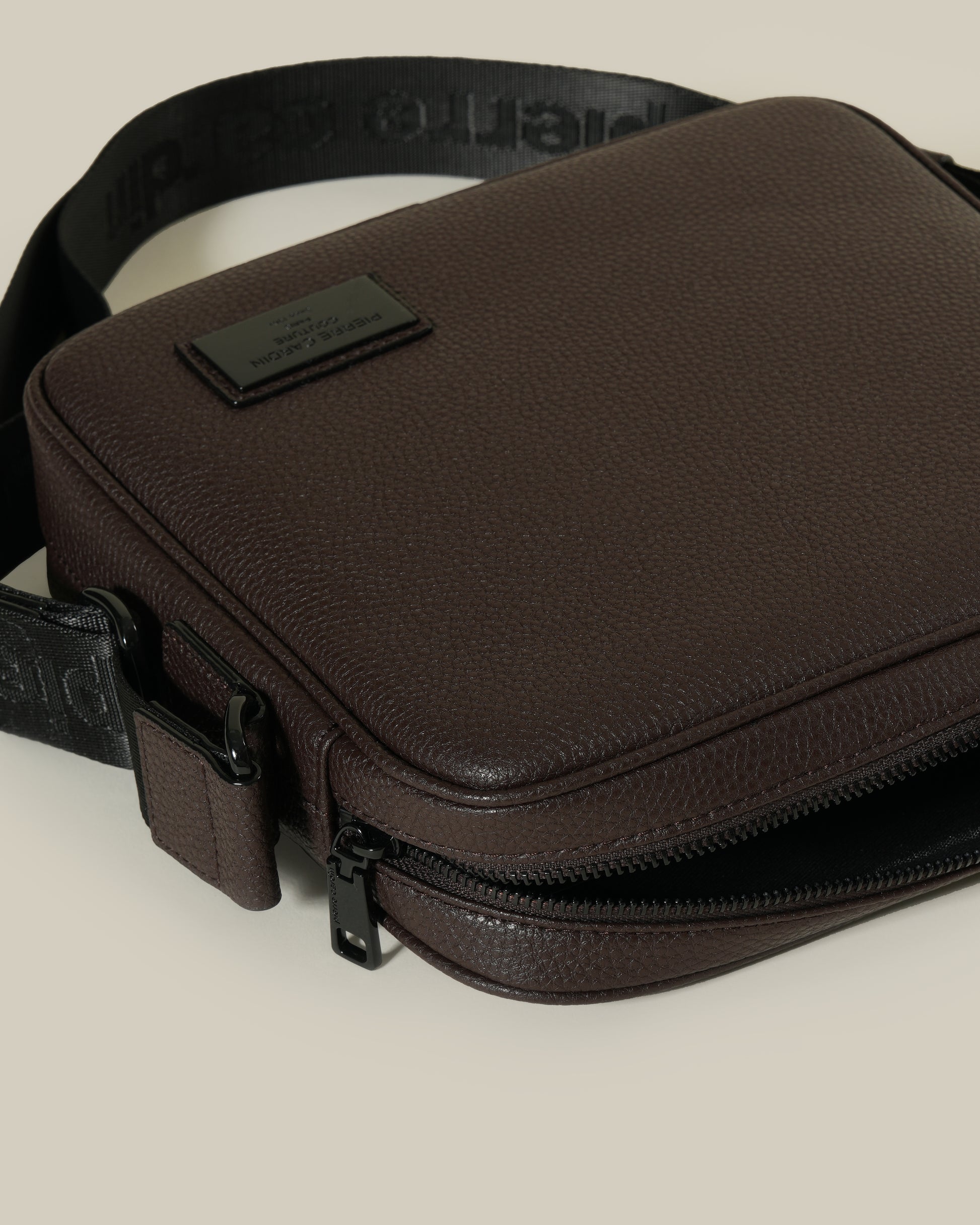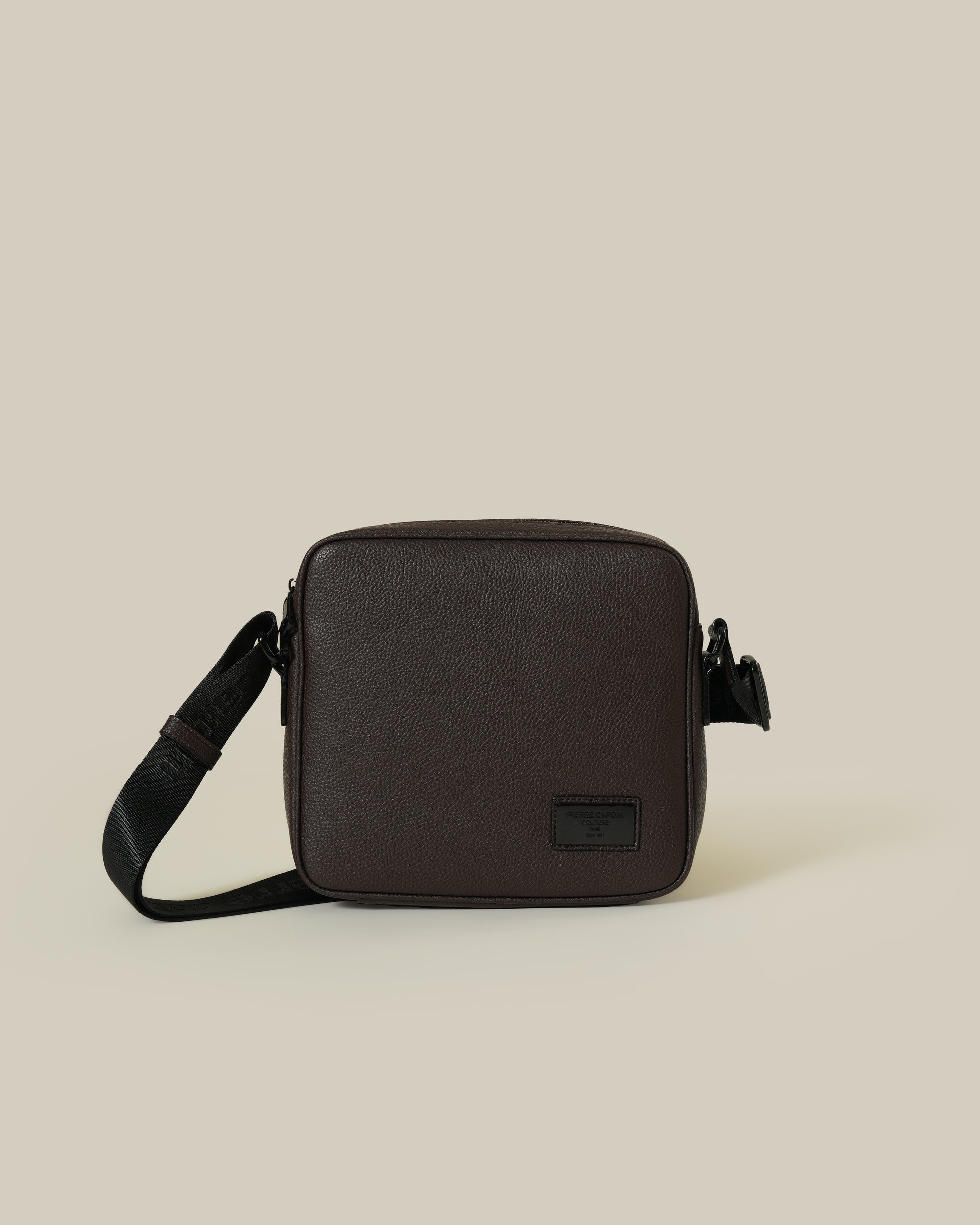 Embellished with patch-branded detailing, this crossbody bag is sleek and practical. This elegant bag is made out of Brown Milled leather and comes with a Black woven shoulder strap. Compartments close with zippers for extra security.